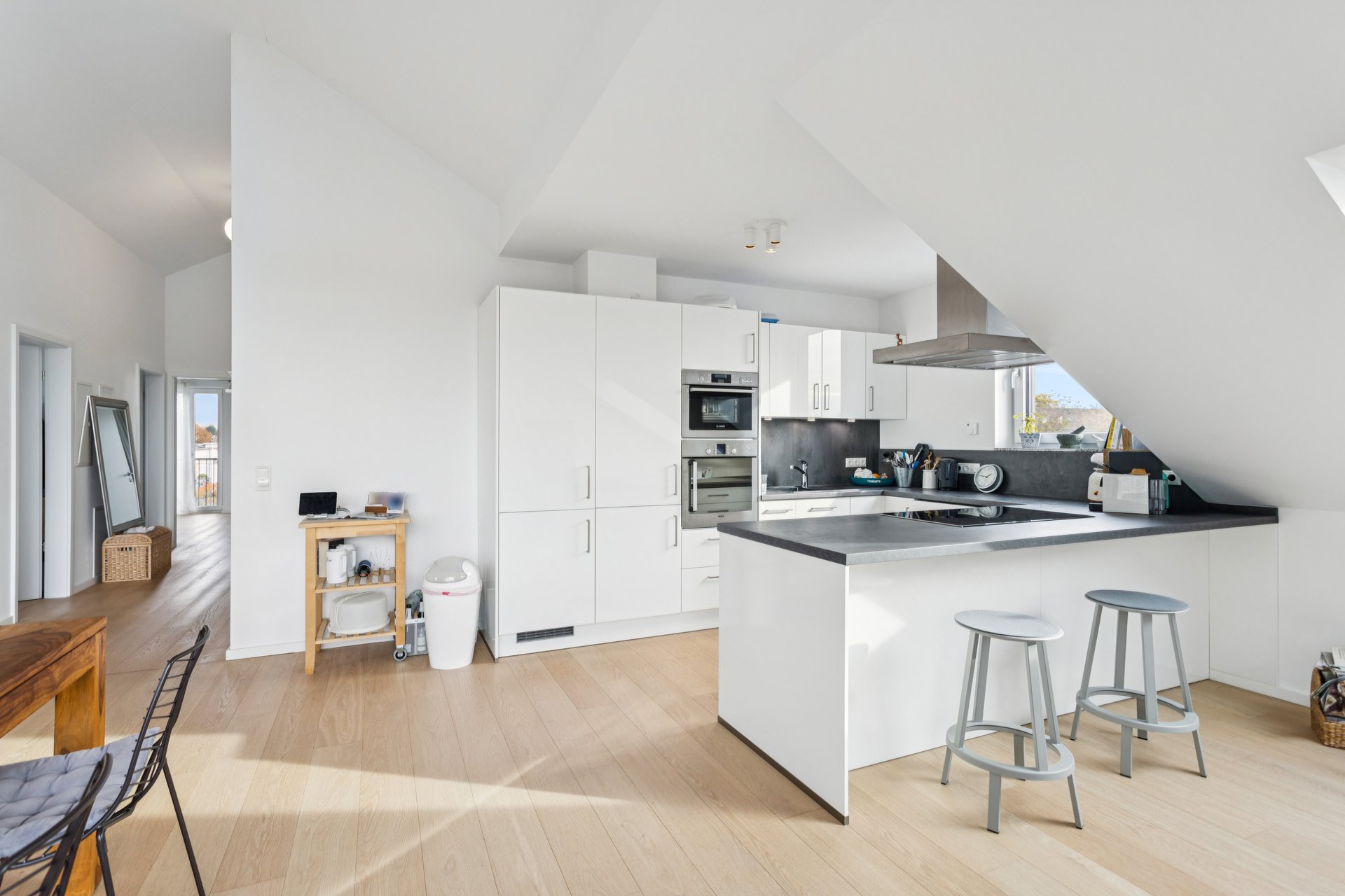 Die Ausstattung ist gehoben und neuwertig. Die Böden sind mit hochwertigem Parkett und Steinbelägen versehen. Zur Immobilie gehört ein Außenstellplatz. Ein Aufzug gewährleistet bequemen Zugang zu allen Etagen, und ein Keller sowie ein Abstellraum bieten zusätzlichen Stauraum. Die barrierefreie Gestaltung sorgt für Komfort und Zugänglichkeit.